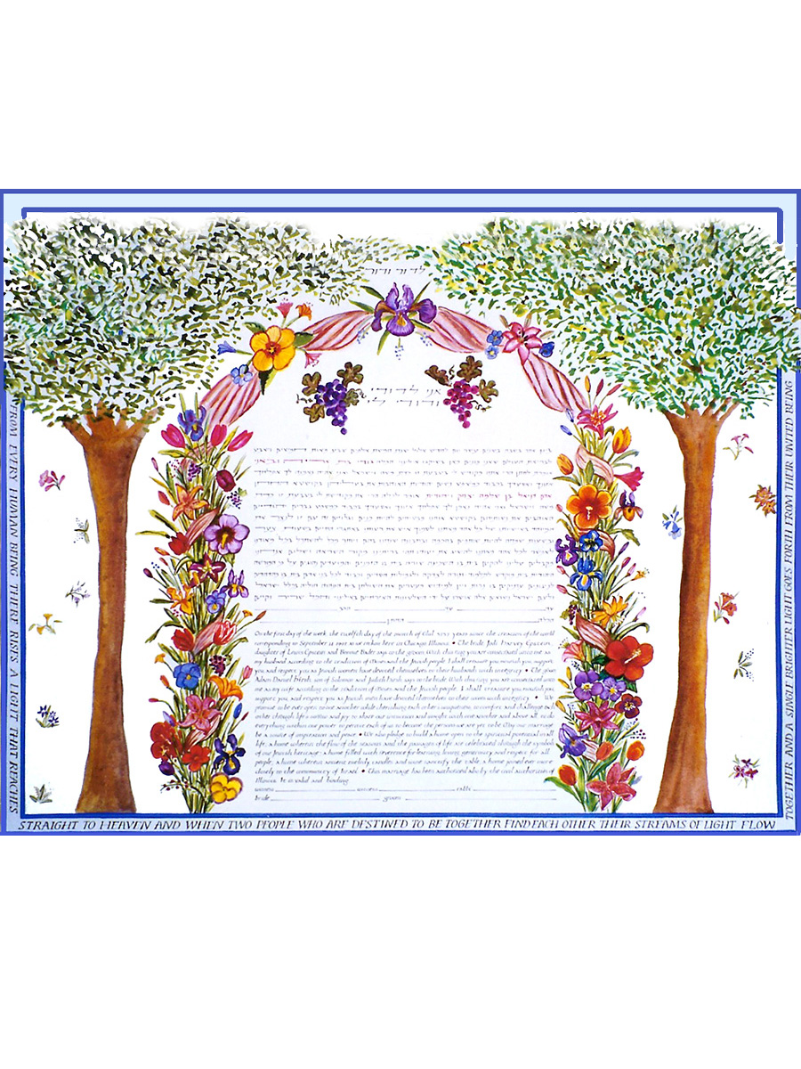 The Traditional Orthodox ketubah text, written in Aramaic, is a legal formula stating the terms of the marriage and giving the bride property rights. Because there can be slight variations in spelling depending on your rabbi, it’s very important that the text be approved by your officiant.