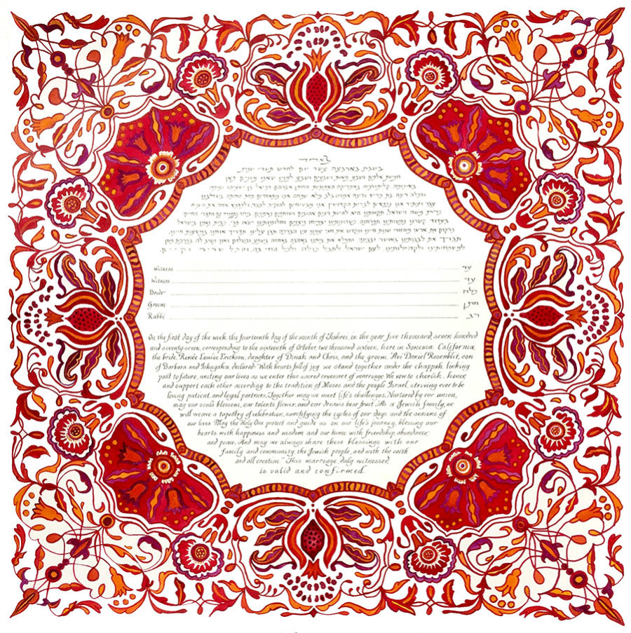 The design of this custom ketubah is based on shapes abstracted from the pomegranate flower and fruit combined with arabesques.