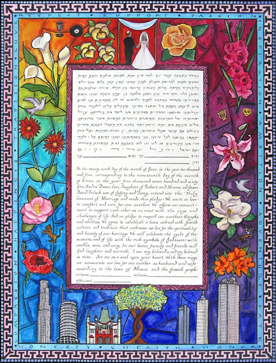 You can begin by thinking of symbols you might want in your ketubah. Some commonly used symbols are: Jewish ceremonial objects, the couple under the chuppah, clasped hands, Jerusalem, etc. Many couples include symbols of cities important in their lives, places they have traveled, their pets and their hobbies. Don’t feel limited to what you see in the ketubah examples. Ketubah designs can be based on anything: historical examples, patterns from china, rugs, lace, etc. Anything (within reason) can be a motif for a ketubah.
