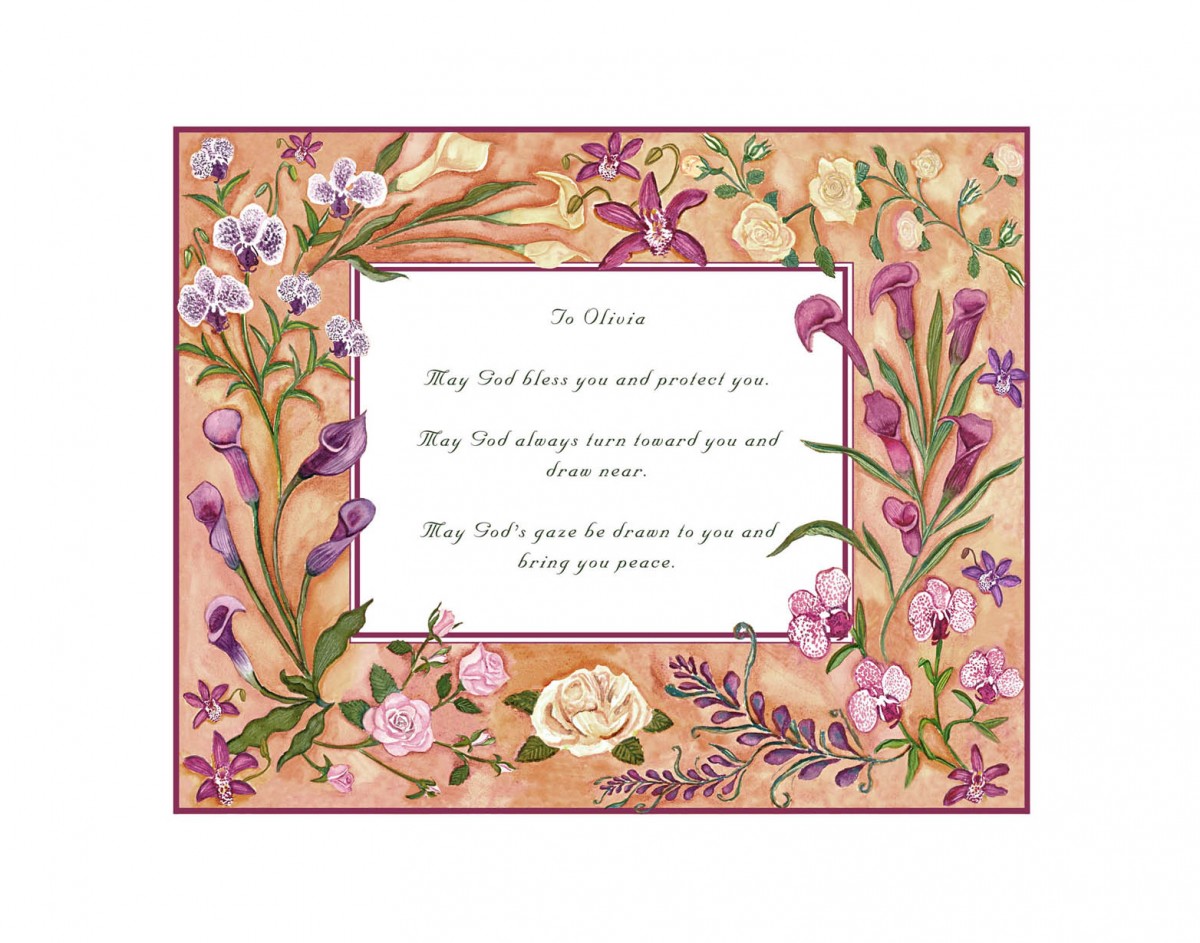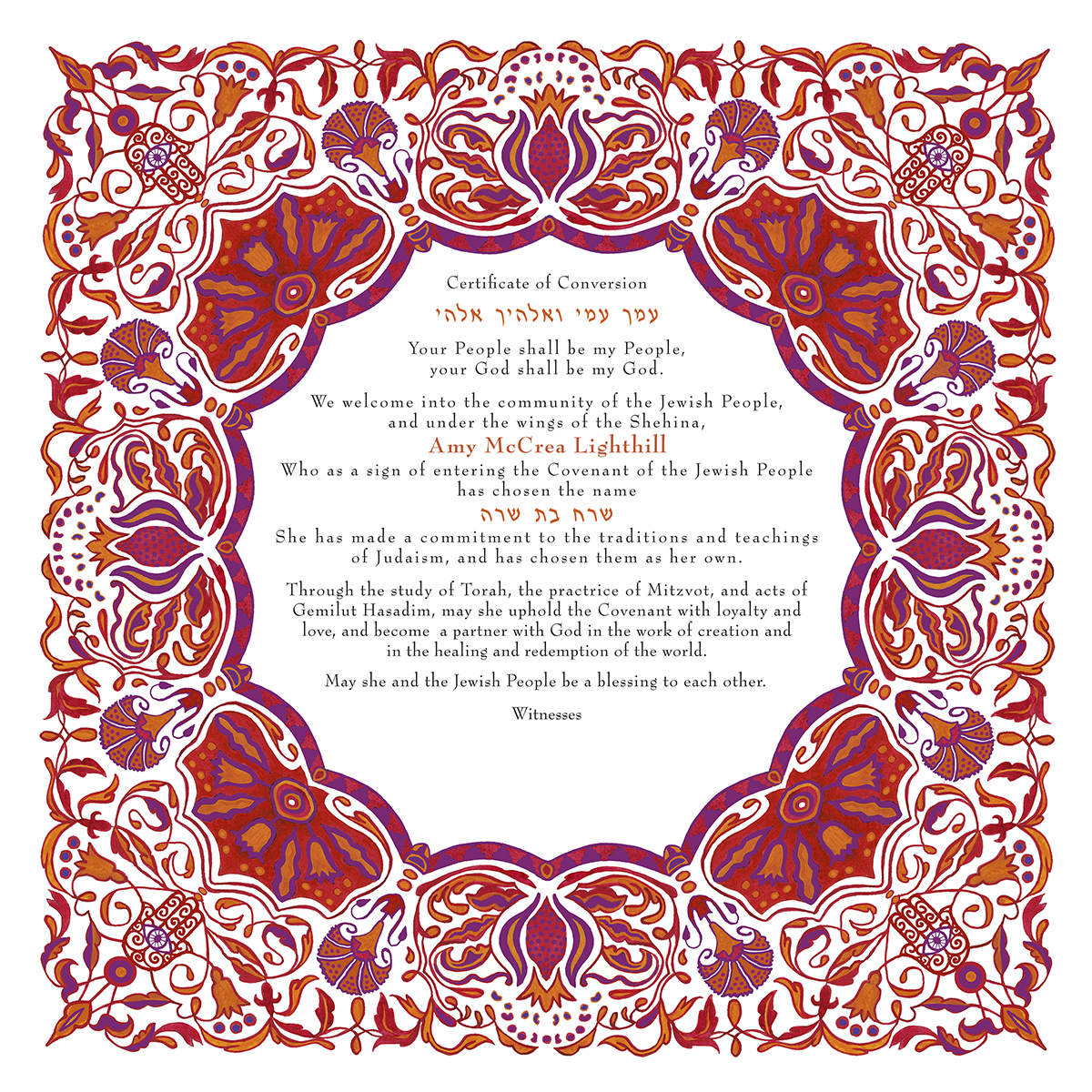 Naming artwork can be for the birth of a child, to commemorate the new Hebrew name assumed in a conversion ceremony, or any other occasion when a new name is chosen. A name piece can be a unique commission or chosen from available prints, customized with names and dates.