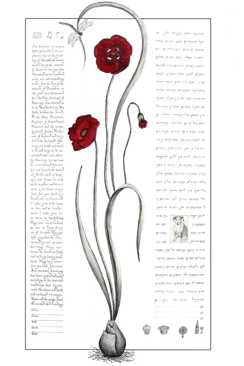 Here’s a guide for choosing a text for your wedding. Besides Hebrew/Aramaic and English texts, I’ve also done them in Spanish, French, Japanese, and Yiddish. Ask me about translation services.