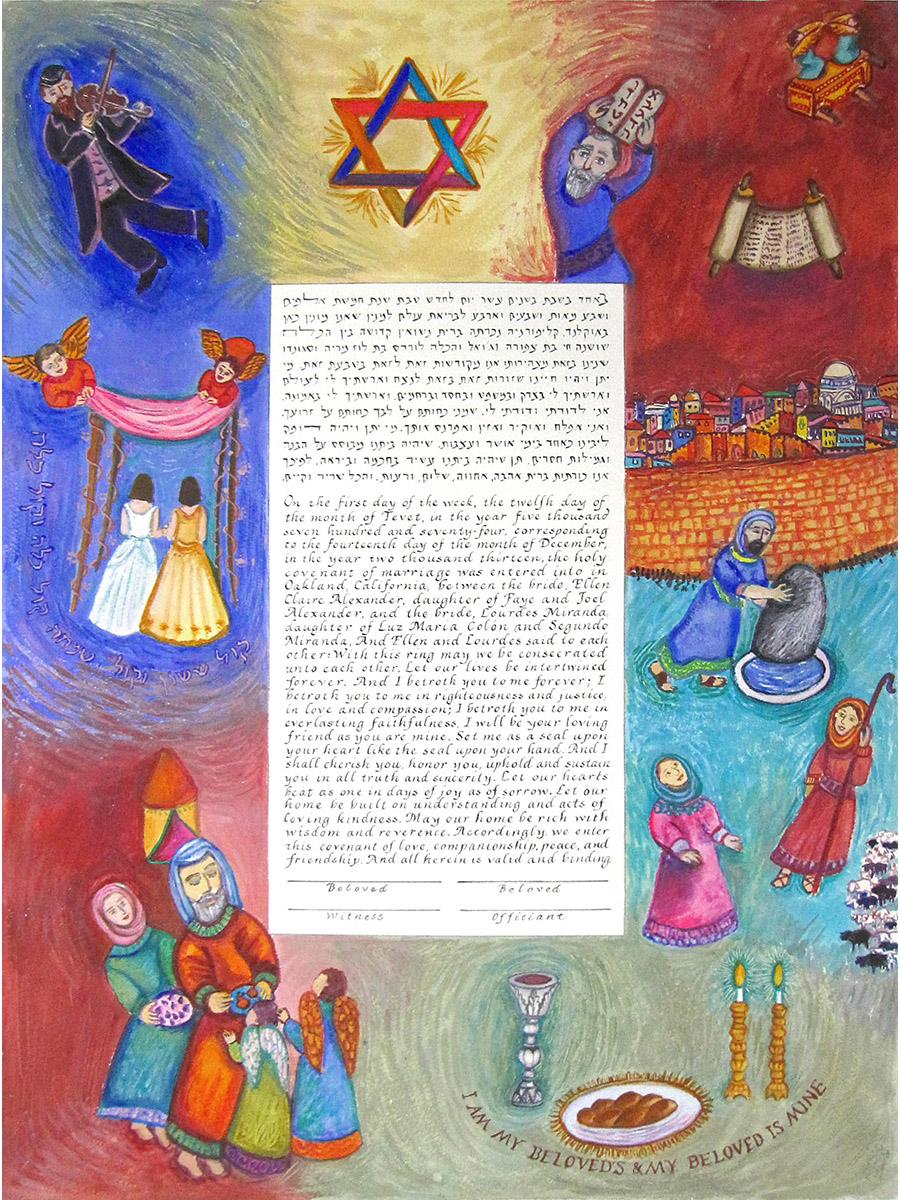 Here’s a guide for choosing a text for your wedding. Besides Hebrew/Aramaic and English texts, I’ve also done them in Spanish, French, Japanese, and Yiddish. Ask me about translation services.