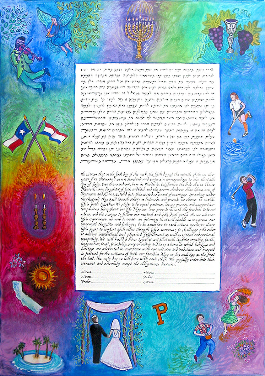 You can begin by thinking of symbols you might want in your ketubah. Some commonly used symbols are: Jewish ceremonial objects, the couple under the chuppah, clasped hands, Jerusalem, etc. Many couples include symbols of cities important in their lives, places they have traveled, their pets and their hobbies. Don’t feel limited to what you see in the ketubah examples. Ketubah designs can be based on anything: historical examples, patterns from china, rugs, lace, etc. Anything (within reason) can be a motif for a ketubah.