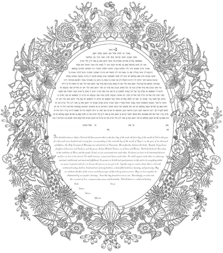 The Traditional Orthodox ketubah text, written in Aramaic, is a legal formula stating the terms of the marriage and giving the bride property rights. Because there can be slight variations in spelling depending on your rabbi, it’s very important that the text is approved by your officiant.