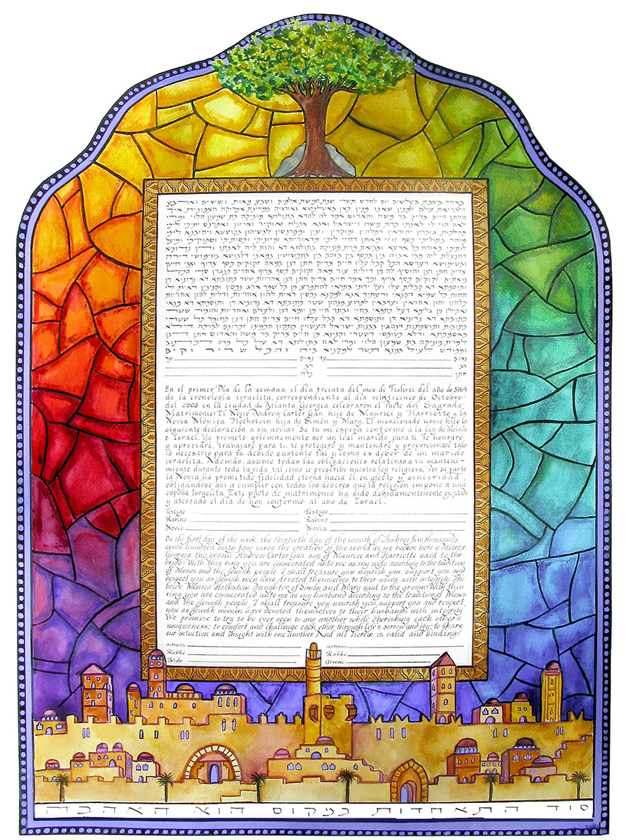 The Traditional Orthodox ketubah text, written in Aramaic, is a legal formula stating the terms of the marriage and giving the bride property rights. Because there can be slight variations in spelling depending on your rabbi, it’s very important that the text be approved by your officiant.