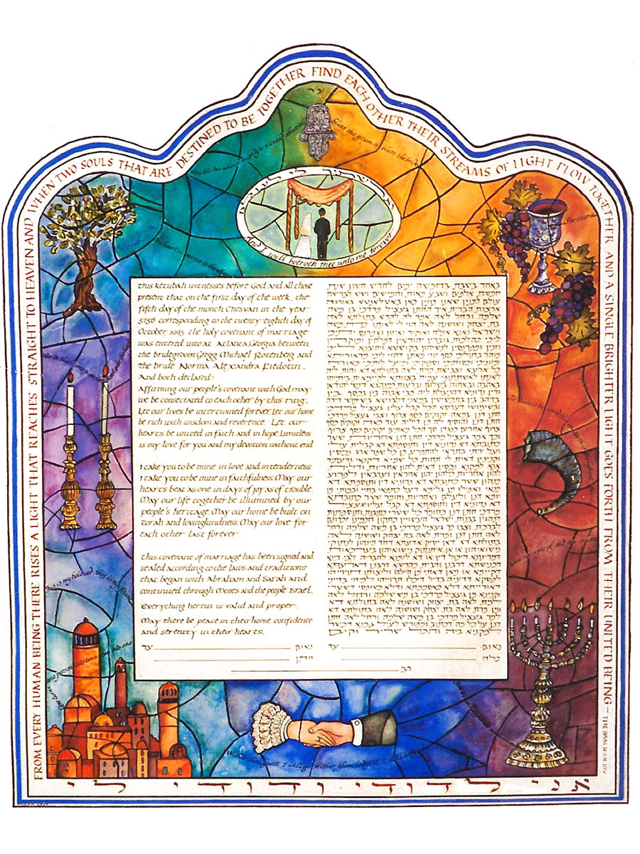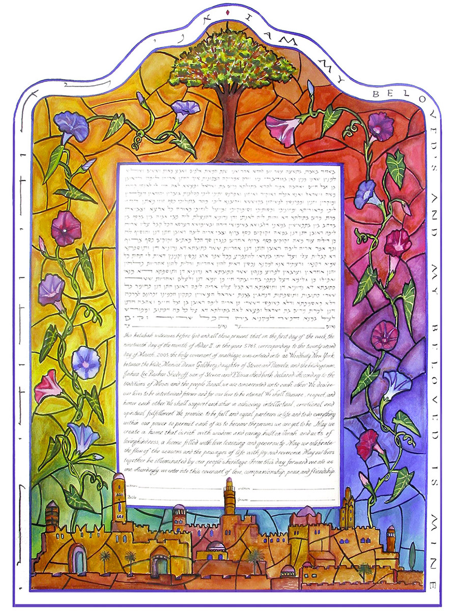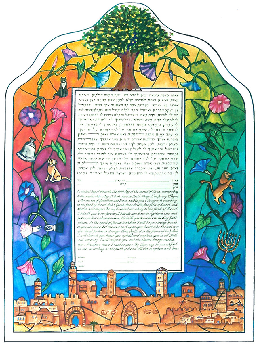 You can begin by thinking of symbols you might want in your ketubah. Some commonly used symbols are: Jewish ceremonial objects, the couple under the chuppah, clasped hands, Jerusalem, etc. Many couples include symbols of cities important in their lives, places they have traveled, their pets and their hobbies. Don’t feel limited to what you see in the ketubah examples. Ketubah designs can be based on anything: historical examples, patterns from china, rugs, lace, etc. Anything (within reason) can be a motif for a ketubah.