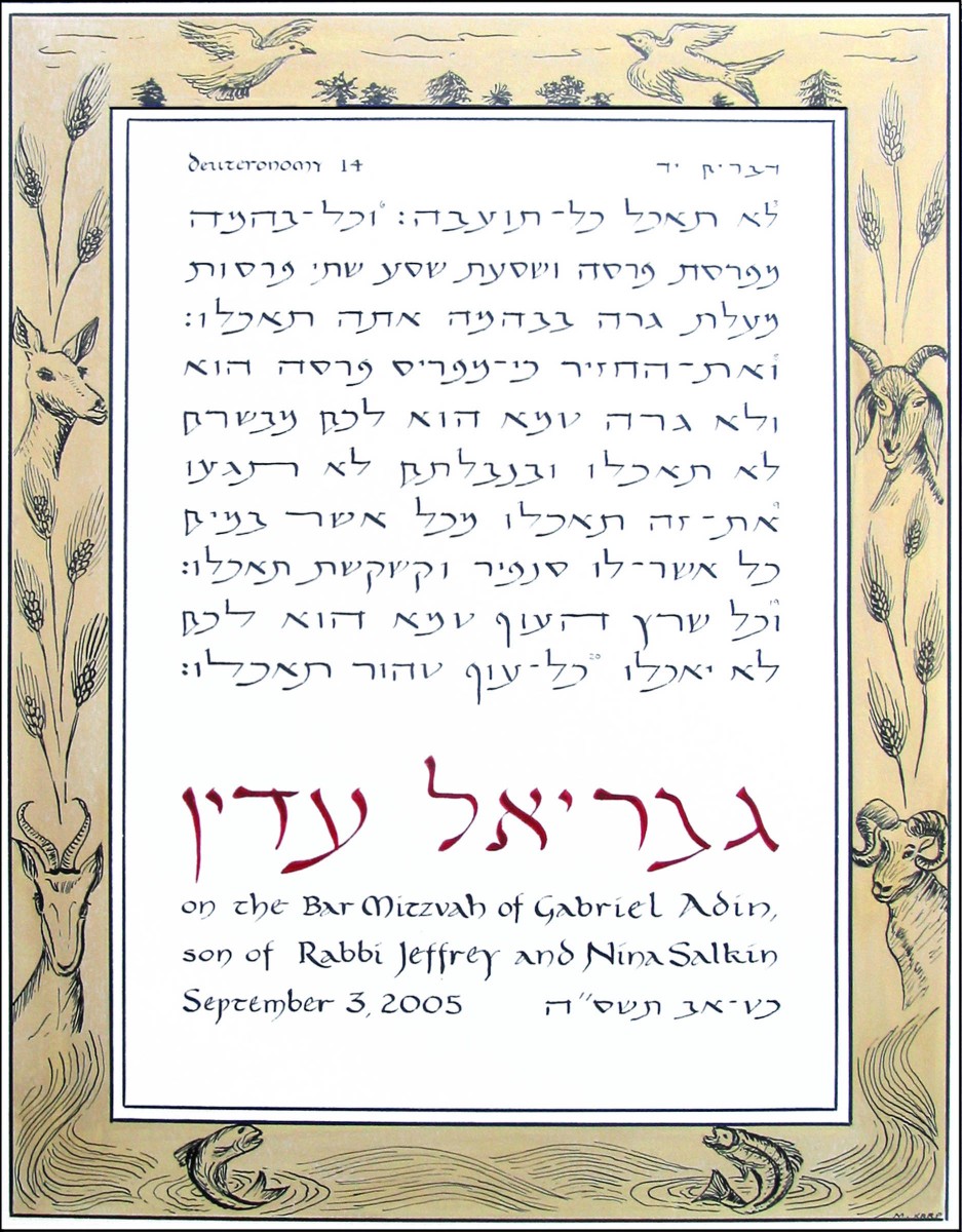 Eat these, but don’t eat those! The laws of Kashrut are the subject of Deuteronomy 14 illustrated in this custom Bar Mitzvah piece. Image size: 14” x 11” . Ink and watercolor on 17” x 14”, Fabriano Artistico 100% cotton watercolor paper. Price range: $450-650.
