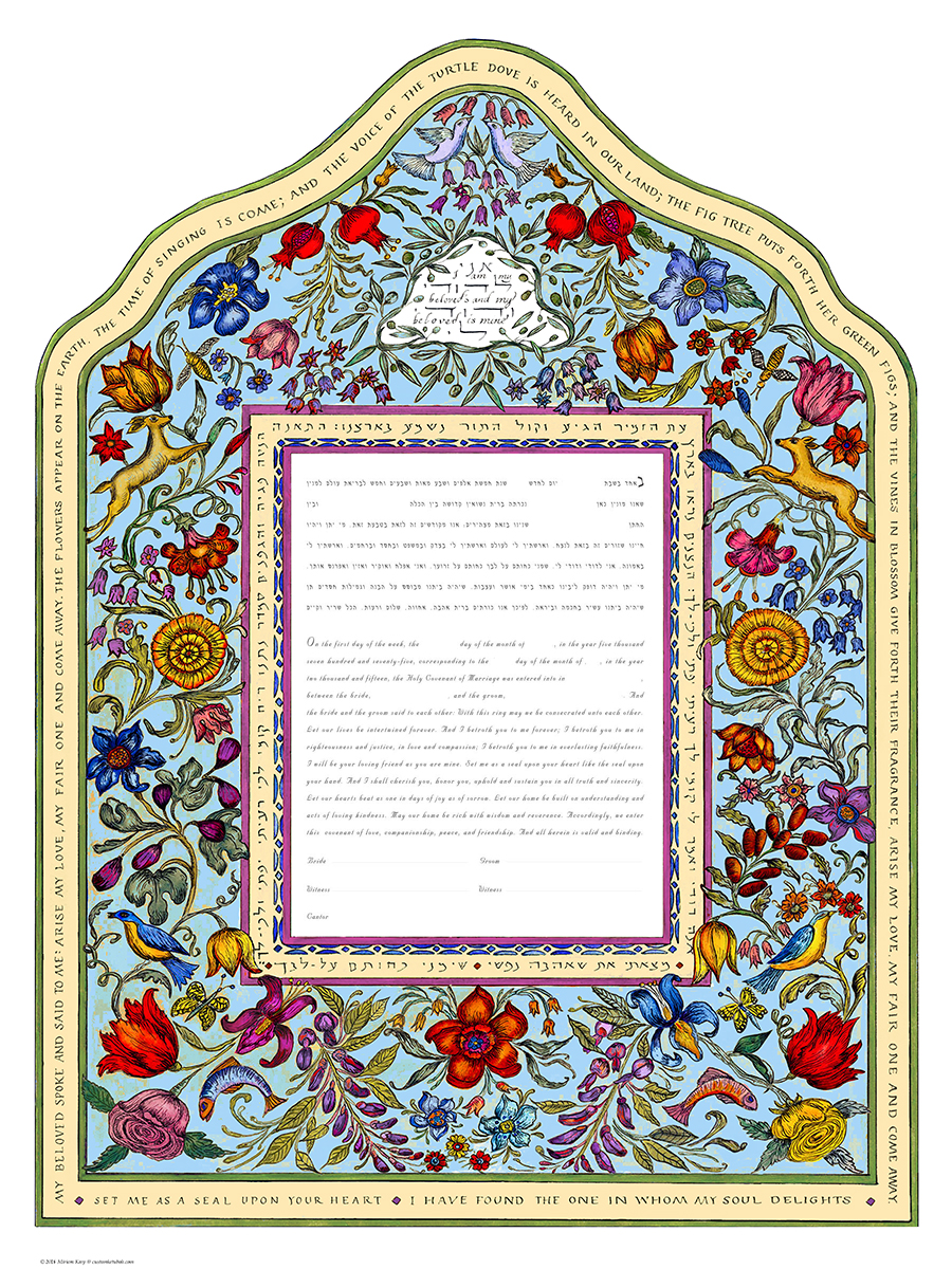 Dutch engraved ketubahs from the 17th century are the inspiration for this ketubah print.  Border quotations include:  “My beloved spoke and said to me: Arise my love, my fair one and come away. The flowers appear on the earth and the time of singing has come; and the voice of the turtle dove is heard in the land; the fig tree puts forth her green figs; and the vines in blossom give forth their fragrance. Arise my love, my fair one and come away.”  Customization available for color and quotation changes. Archival Giclée print. Print size: 24” x 18.”