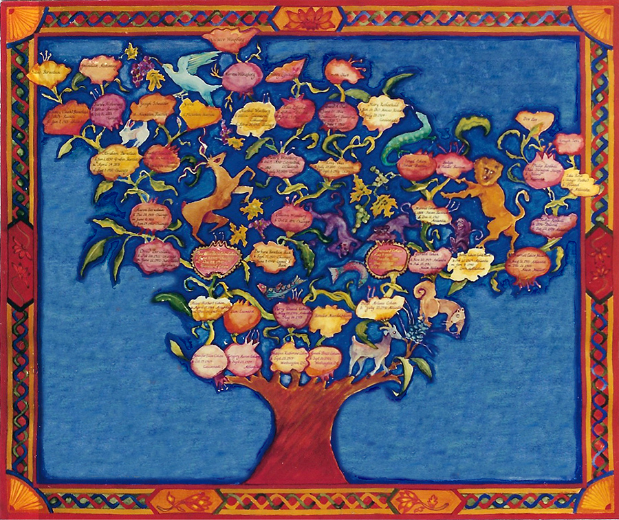 An anniversary present for a couple who collected “hear no evil, see no evil, speak no evil” sculptures, this family tree includes the three monkeys in the middle along with a variety of other animals, and fruits and flowers.