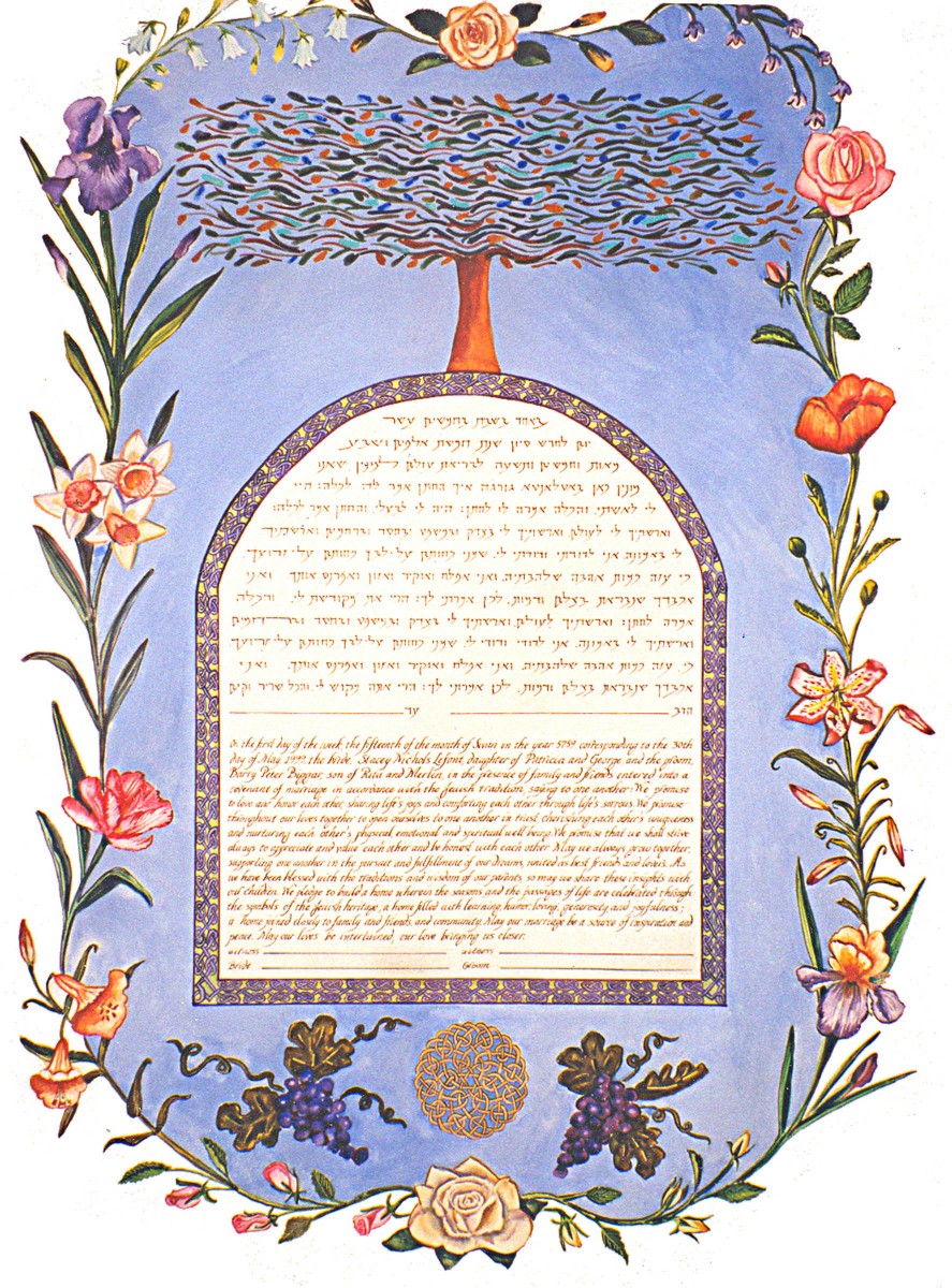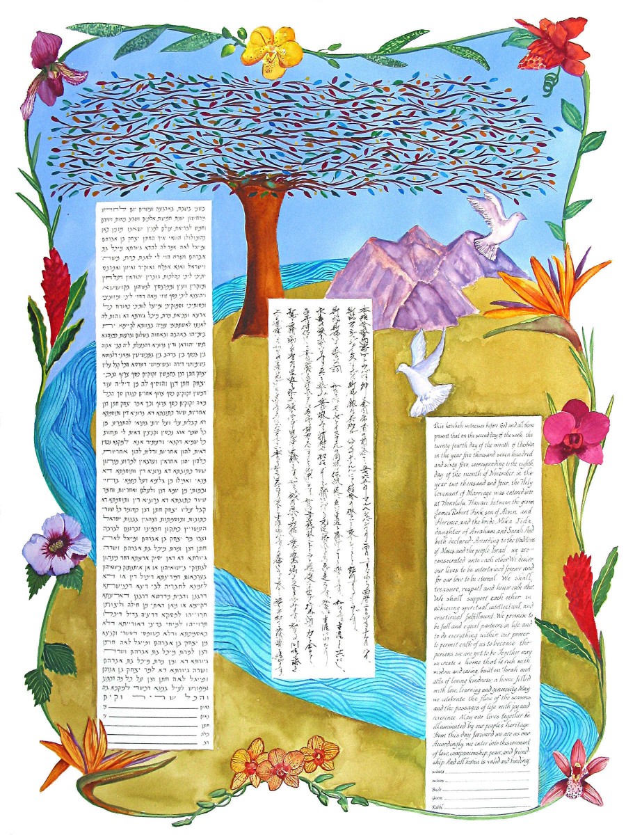 Here’s a guide for choosing a text for your wedding. Besides Hebrew/Aramaic and English texts, I’ve also done them in Spanish, French, Japanese, and Yiddish. Ask me about translation services.