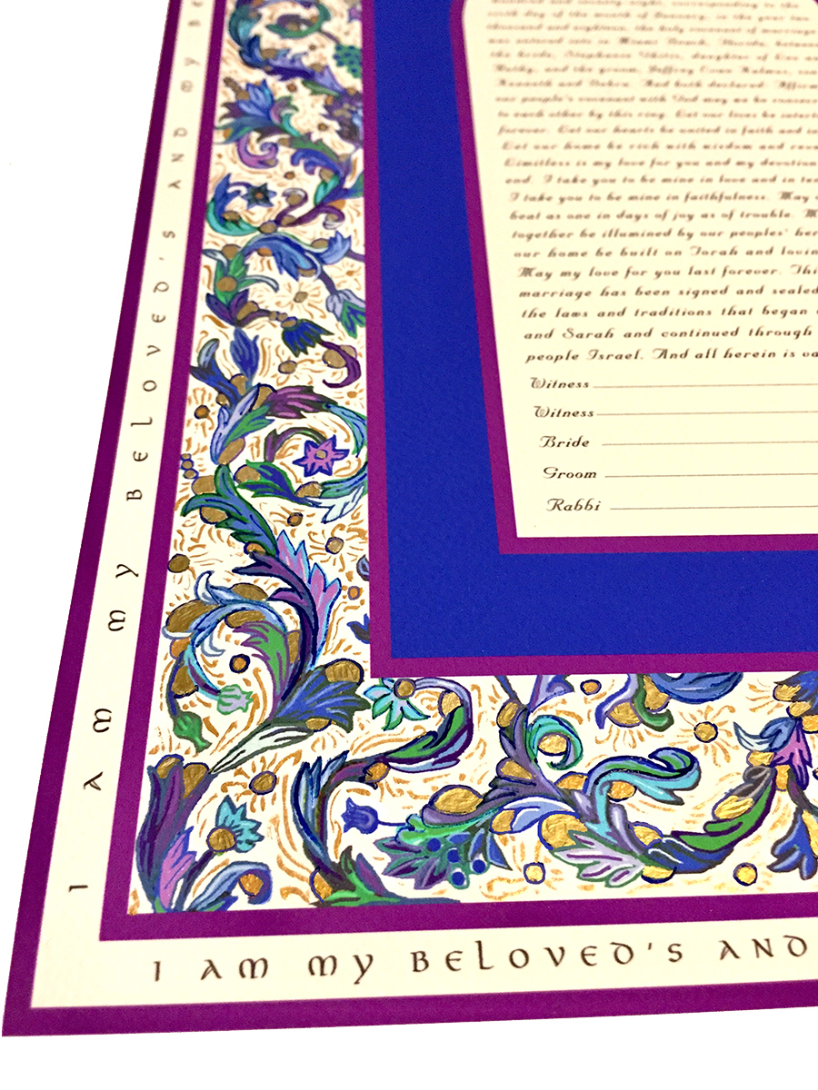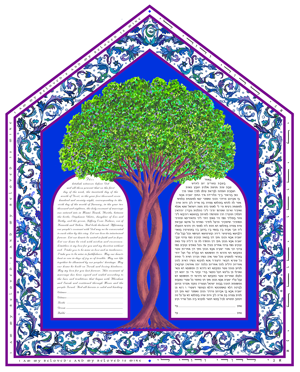 These Ketubah Prints are available as seen in the gallery. In the ordering process you’ll choose the appropriate print version, the material on which it’s printed, whether or not you want it personalized, the text(s), your ideas for customization, and your method of shipping.