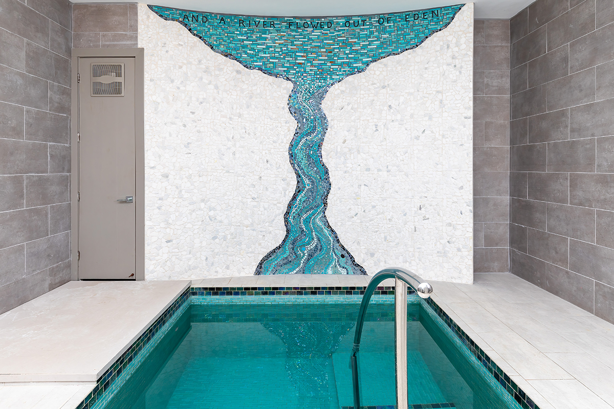 I created this 10′ x 12′ mosaic wall for the new Mei Shifrah Women’s Mikvah at Congregation Bet Tefillah in Sandy Springs, Georgia in 2019. The quotation at the top is from Genesis 2:10 “And a river flowed out of Eden”