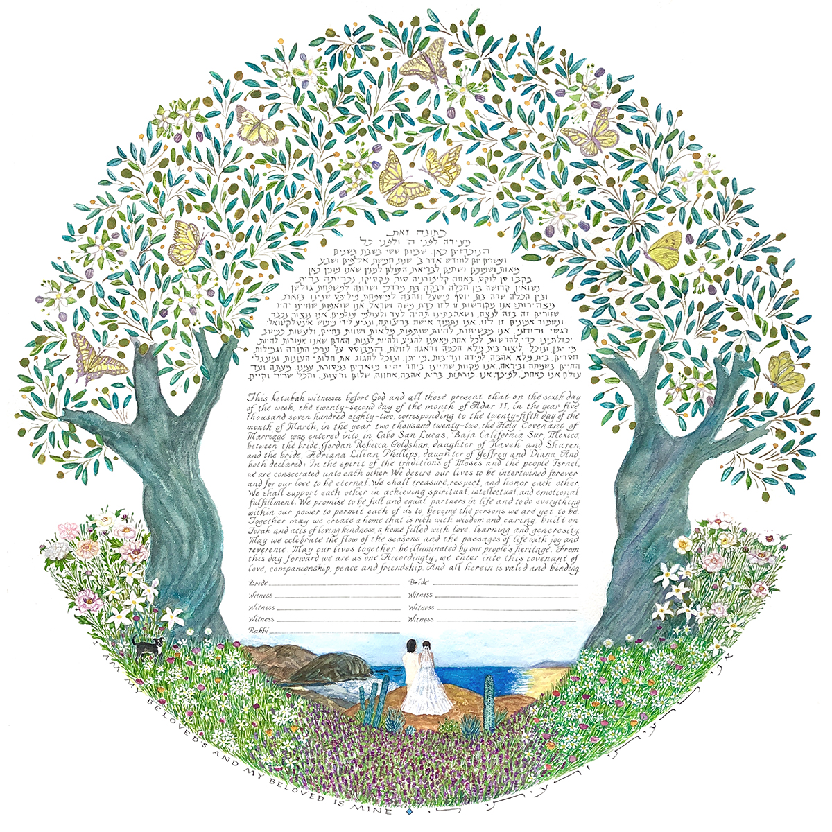 The Traditional Orthodox ketubah text, written in Aramaic, is a legal formula stating the terms of the marriage and giving the bride property rights. Because there can be slight variations in spelling depending on your rabbi, it’s very important that the text be approved by your officiant.