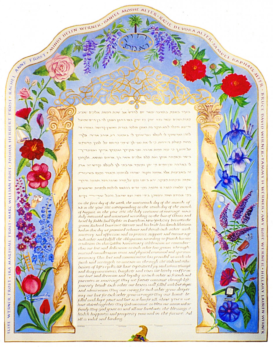 Here’s a guide for choosing a text for your wedding. Besides Hebrew/Aramaic and English texts, I’ve also done them in Spanish, French, Japanese, and Yiddish. Ask me about translation services.