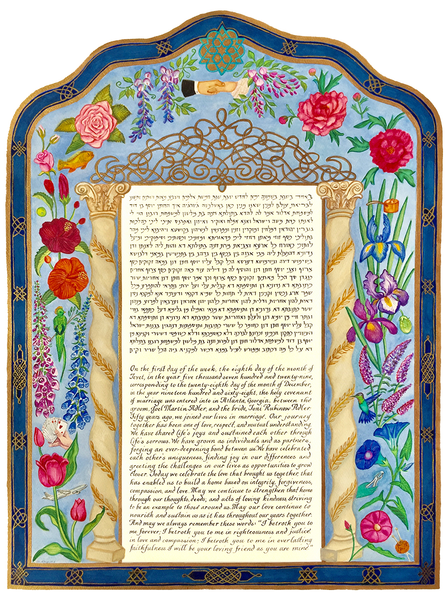 You can begin by thinking of symbols you might want in your ketubah. Some commonly used symbols are: Jewish ceremonial objects, the couple under the chuppah, clasped hands, Jerusalem, etc. Many couples include symbols of cities important in their lives, places they have traveled, their pets and their hobbies. Don’t feel limited to what you see in the ketubah examples. Ketubah designs can be based on anything: historical examples, patterns from china, rugs, lace, etc. Anything (within reason) can be a motif for a ketubah.