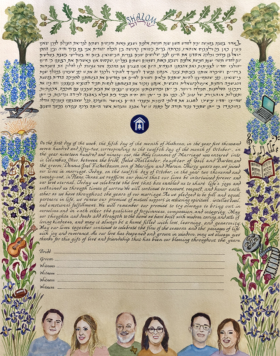 A ketubah commissioned by their children for their 30th wedding anniversary celebrates this couple’s life in Texas.