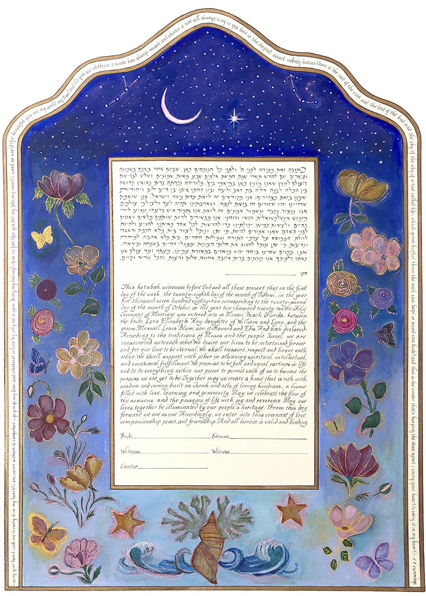 The price of a ketubah print includes one of my text combinations. You can decide to leave the fill-ins (names, date of wedding, etc.) blank for your officiant to complete, or have me personalize the texts. If you provide a different text there is an additional fee.