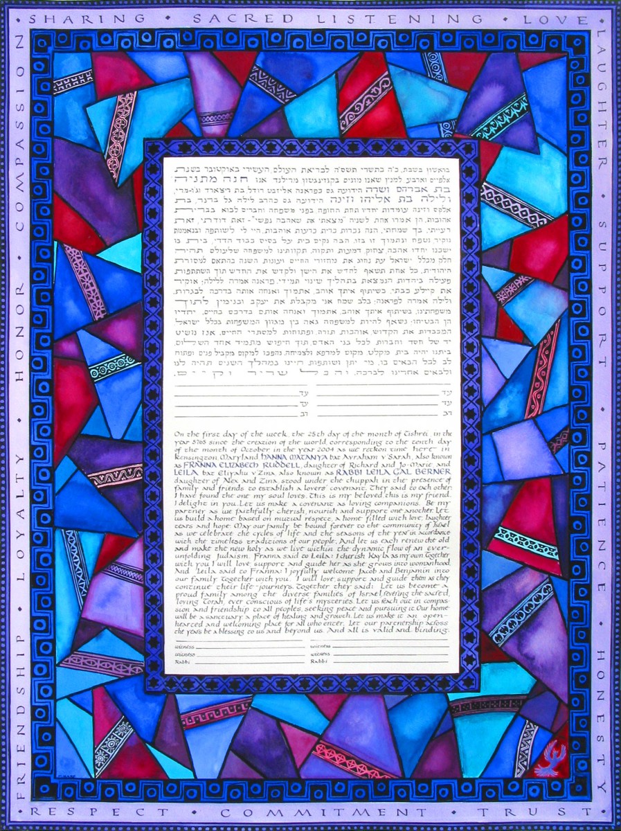 You can begin by thinking of symbols you might want in your ketubah. Some commonly used symbols are: Jewish ceremonial objects, the couple under the chuppah, clasped hands, Jerusalem, etc. Many couples include symbols of cities important in their lives, places they have traveled, their pets and their hobbies. Don’t feel limited to what you see in the ketubah examples. Ketubah designs can be based on anything: historical examples, patterns from china, rugs, lace, etc. Anything (within reason) can be a motif for a ketubah.