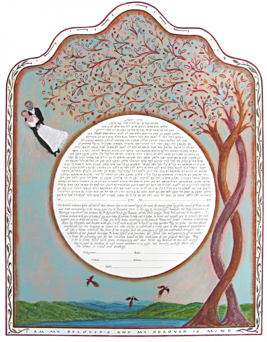 You can begin by thinking of symbols you might want in your ketubah. Some commonly used symbols are: Jewish ceremonial objects, the couple under the chuppah, clasped hands, Jerusalem, etc. Many couples include symbols of cities important in their lives, places they have traveled, their pets and their hobbies. Don’t feel limited to what you see in the ketubah examples. Ketubah designs can be based on anything: historical examples, patterns from china, rugs, lace, etc. Anything (within reason) can be a motif for a ketubah.