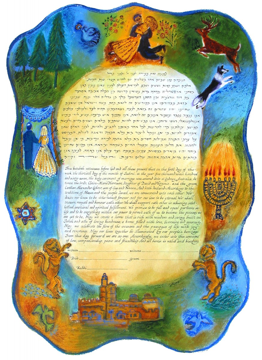 You can begin by thinking of symbols you might want in your ketubah. Some commonly used symbols are: Jewish ceremonial objects, the couple under the chuppah, clasped hands, Jerusalem, etc. Many couples include symbols of cities important in their lives, places they have traveled, their pets and their hobbies. Don’t feel limited to what you see in the ketubah examples. Ketubah designs can be based on anything: historical examples, patterns from china, rugs, lace, etc. Anything (within reason) can be a motif for a ketubah.