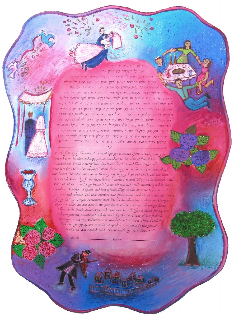 Here’s a guide for choosing a text for your wedding. Besides Hebrew/Aramaic and English texts, I’ve also done them in Spanish, French, Japanese, and Yiddish. Ask me about translation services.
